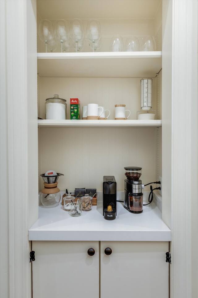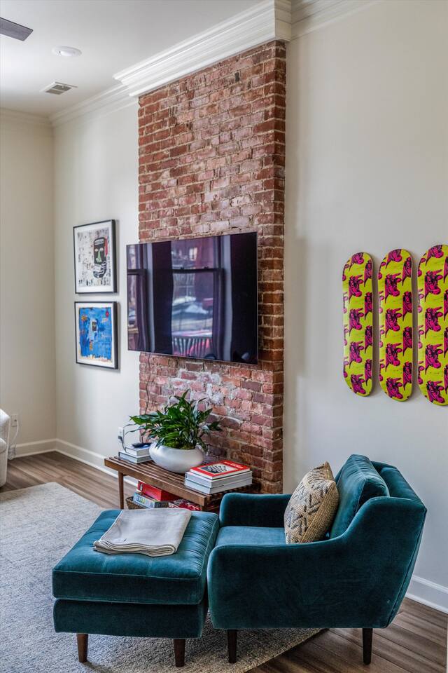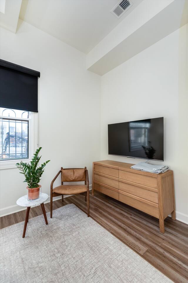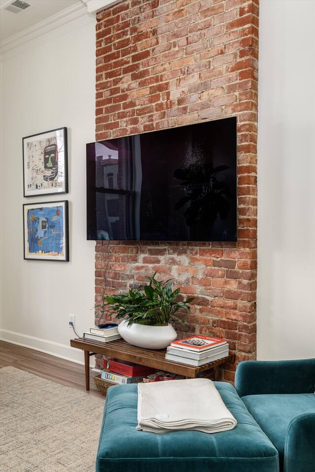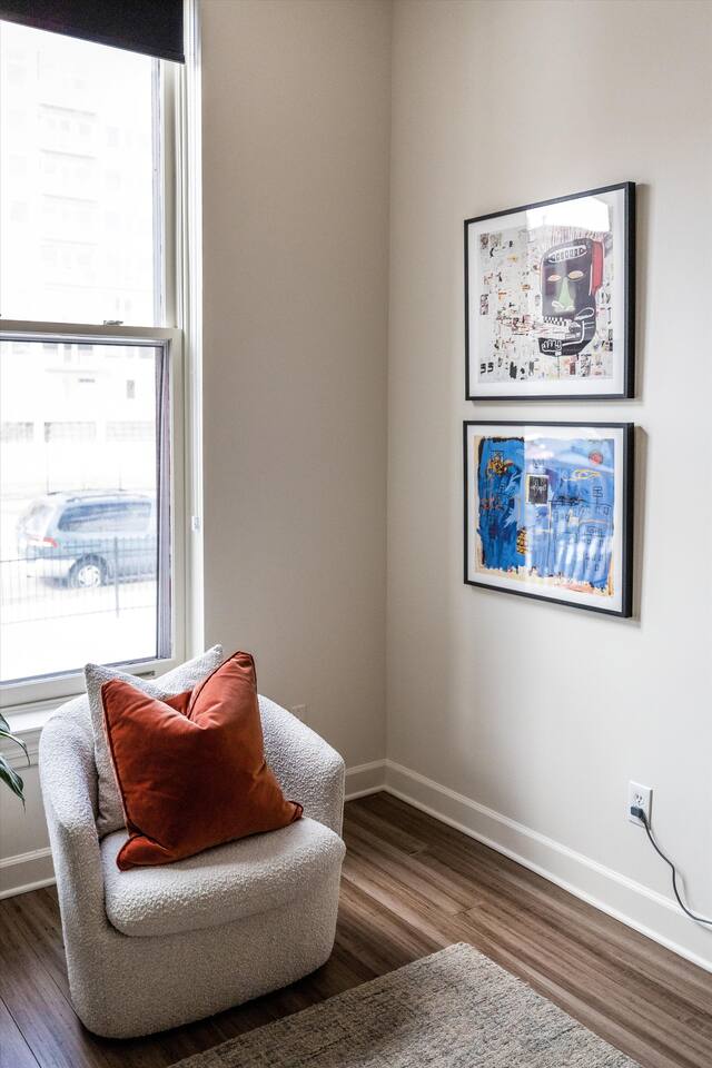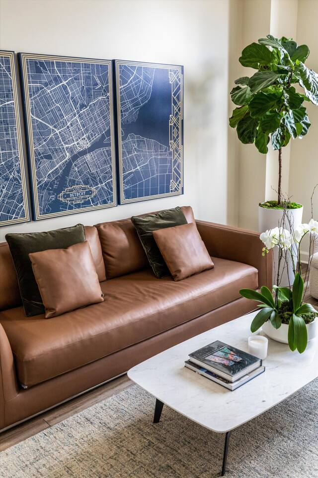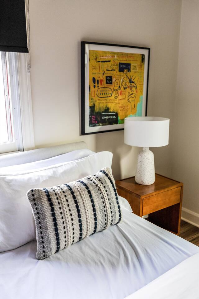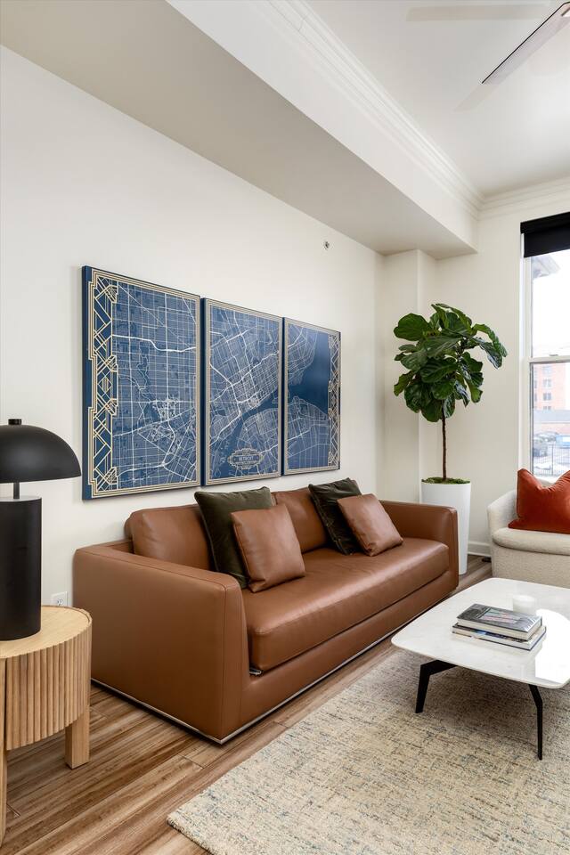 As you step inside, you'll be swept away by the distinguished design and stunning details throughout the home. From the ornate crown molding to the chandeliers, no expense was spared in restoring this storied estate back to its original splendor. Enjoy curated art throughout the space, watch the busy streets of Detroit through story-high windows, or lounge in front of the multiple TVs with free streaming services. The gourmet kitchen is fully-equipped with everything you need to prepare a delicious meal, or dine across the street at the famous Bar Pigalle.